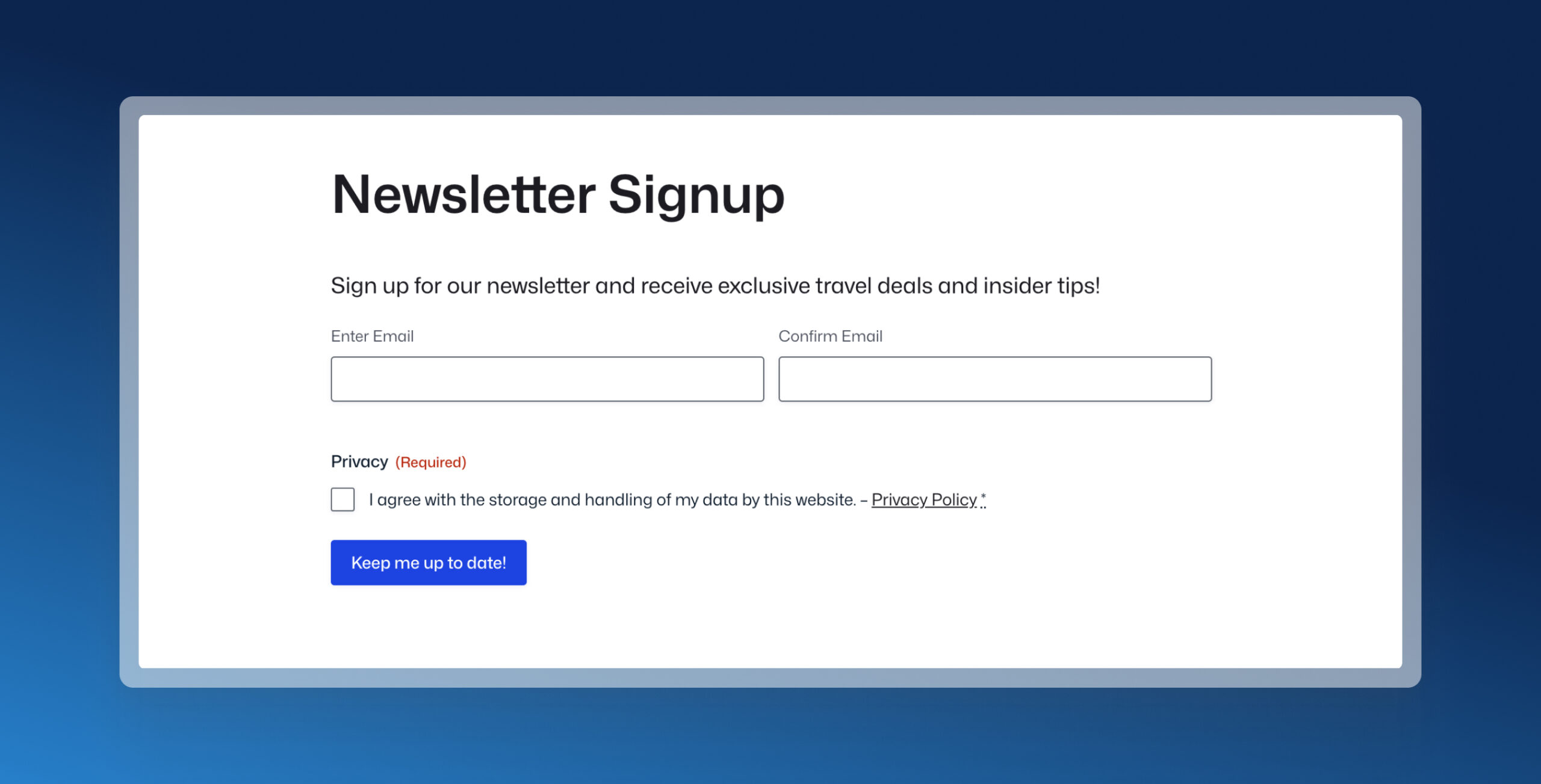 Automatically send a double opt-in message to ensure only legitimate subscribers are added to your mailing list. Simply select Double Opt-in within your form settings to send a confirmation email via Mailchimp’s service to all subscribers – they will only be added to your mailing list once they have responded.