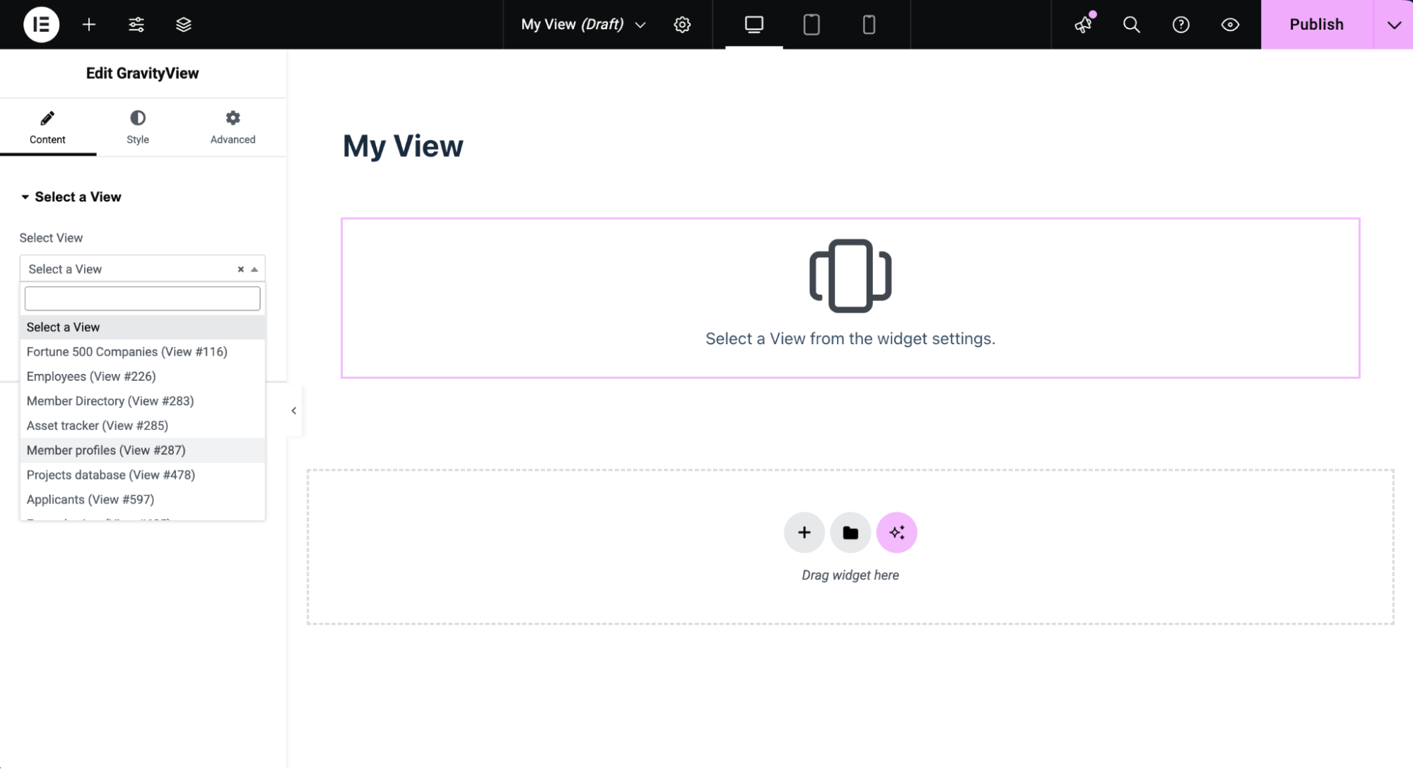 Getting started is as straightforward as adding any other Elementor widget. Search for “GravityView” in the Elementor sidebar, drag the widget onto your page, and select which View you want to display from the dropdown menu.