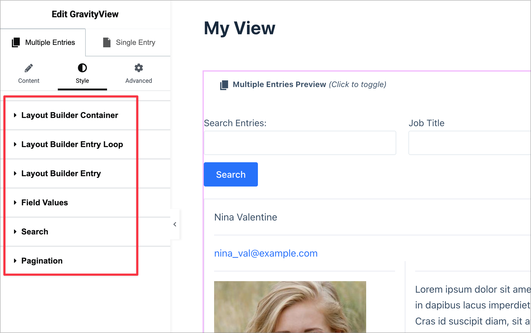 The Style tab gives you precise control over every part of your View. You can toggle between the Multiple Entries and Single Entry pages and adjust styles for each independently.