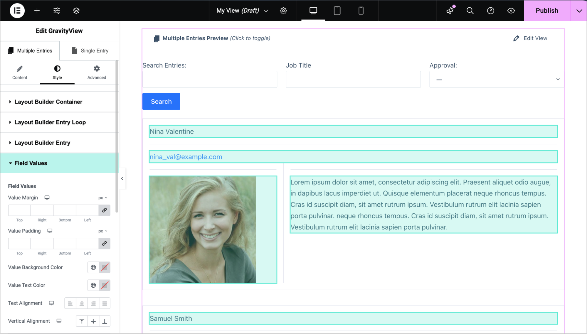 The Advanced Elementor Widget for GravityView, brought to you by GravityKit, brings powerful design flexibility to anyone using Gravity Forms, GravityView, and Elementor together. With this new widget, it’s now possible to design and style front-end displays for your form entries without writing custom CSS.
