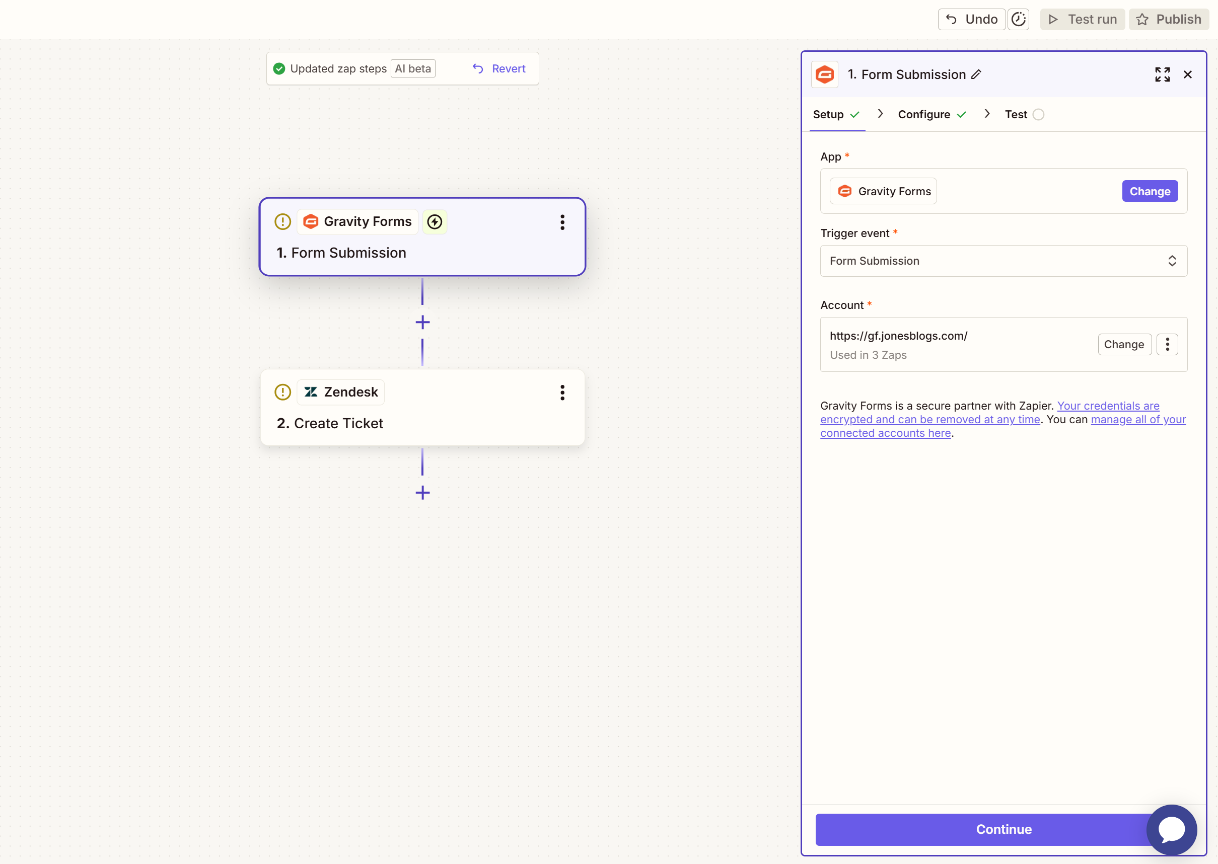 When done, click Yes, Continue to Gravity Forms. After that, that part of the connection should be visible in Zapier and you can move on to the next step by clicking Continue.