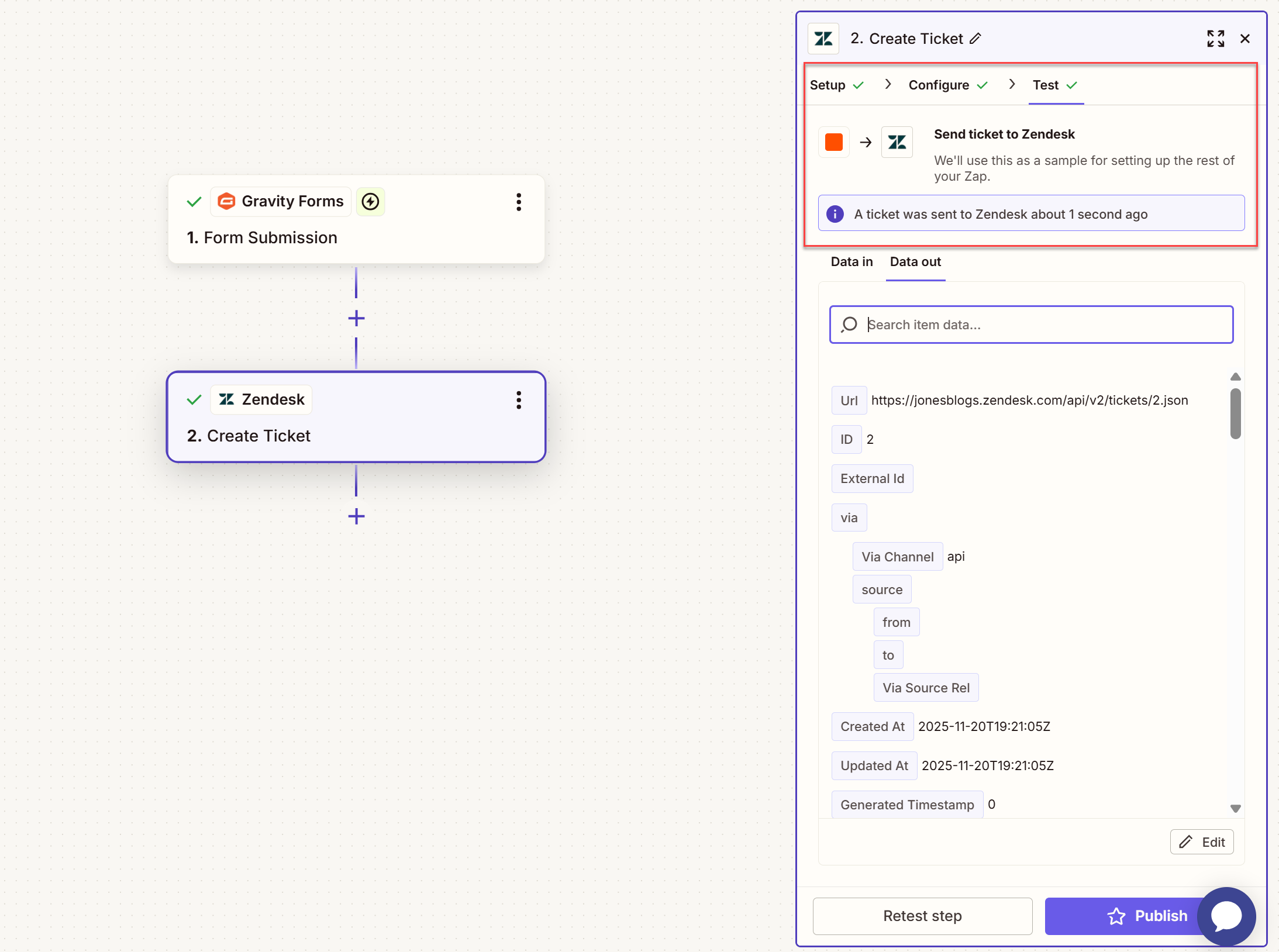 Zapier will now show you the configuration and ask you to test your setup. Click Test Step to run it and send a ticket to Zendesk.