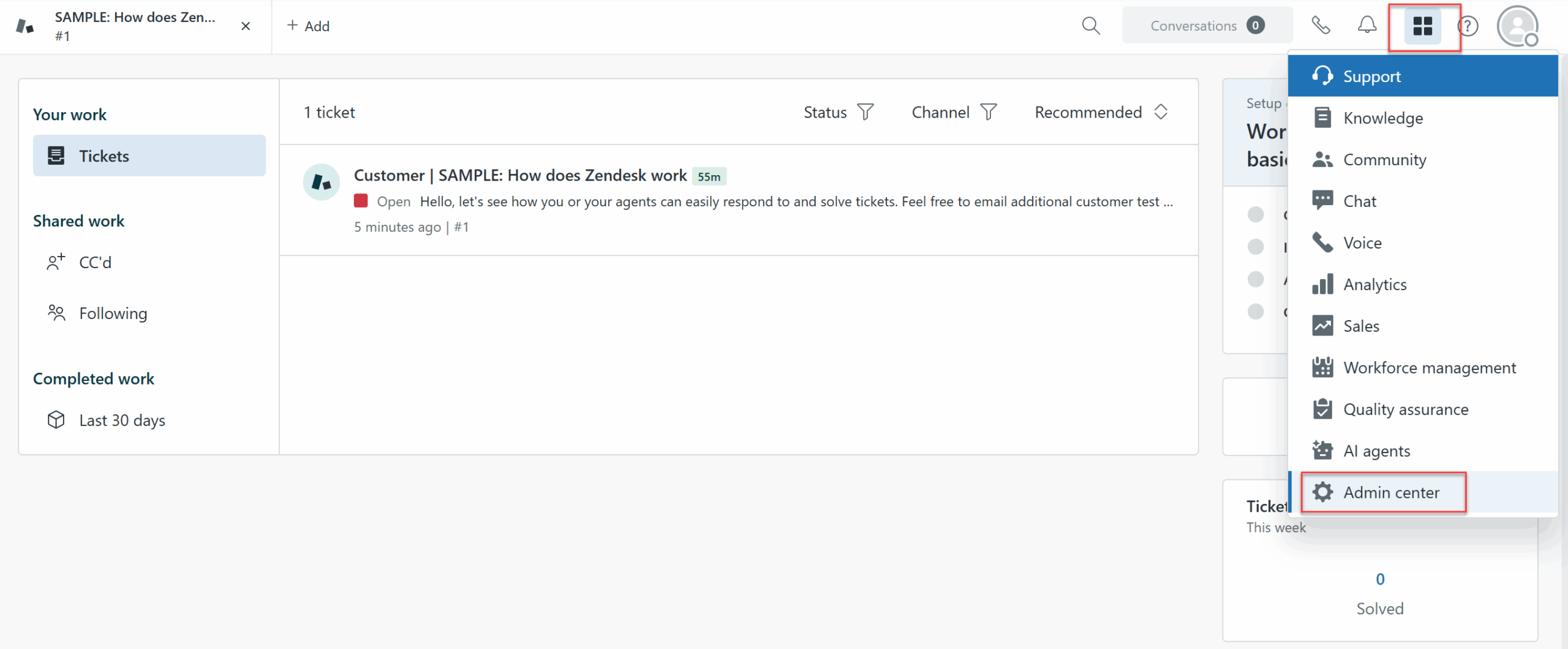 You do this in the Admin Center. You access it by clicking the Zendesk Products option (it looks like four small squares) and then choosing Admin Center.