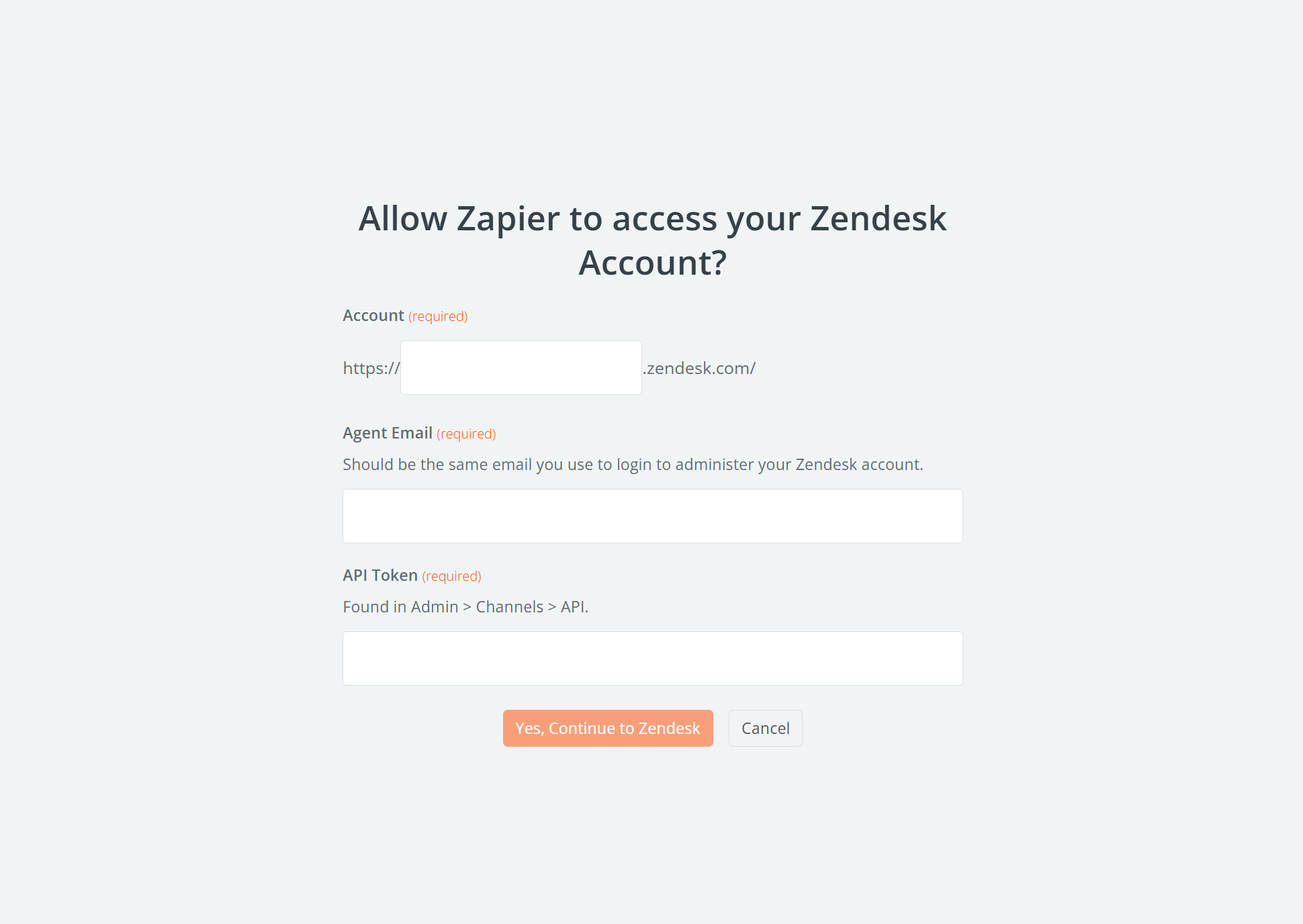 In the second half, we need to establish a connection to the other part of the equation – Zendesk. Again, the Zap you selected will pre-populate the App and Action Event, but it’s here you’ll need to connect Zapier with your Zendesk Account.