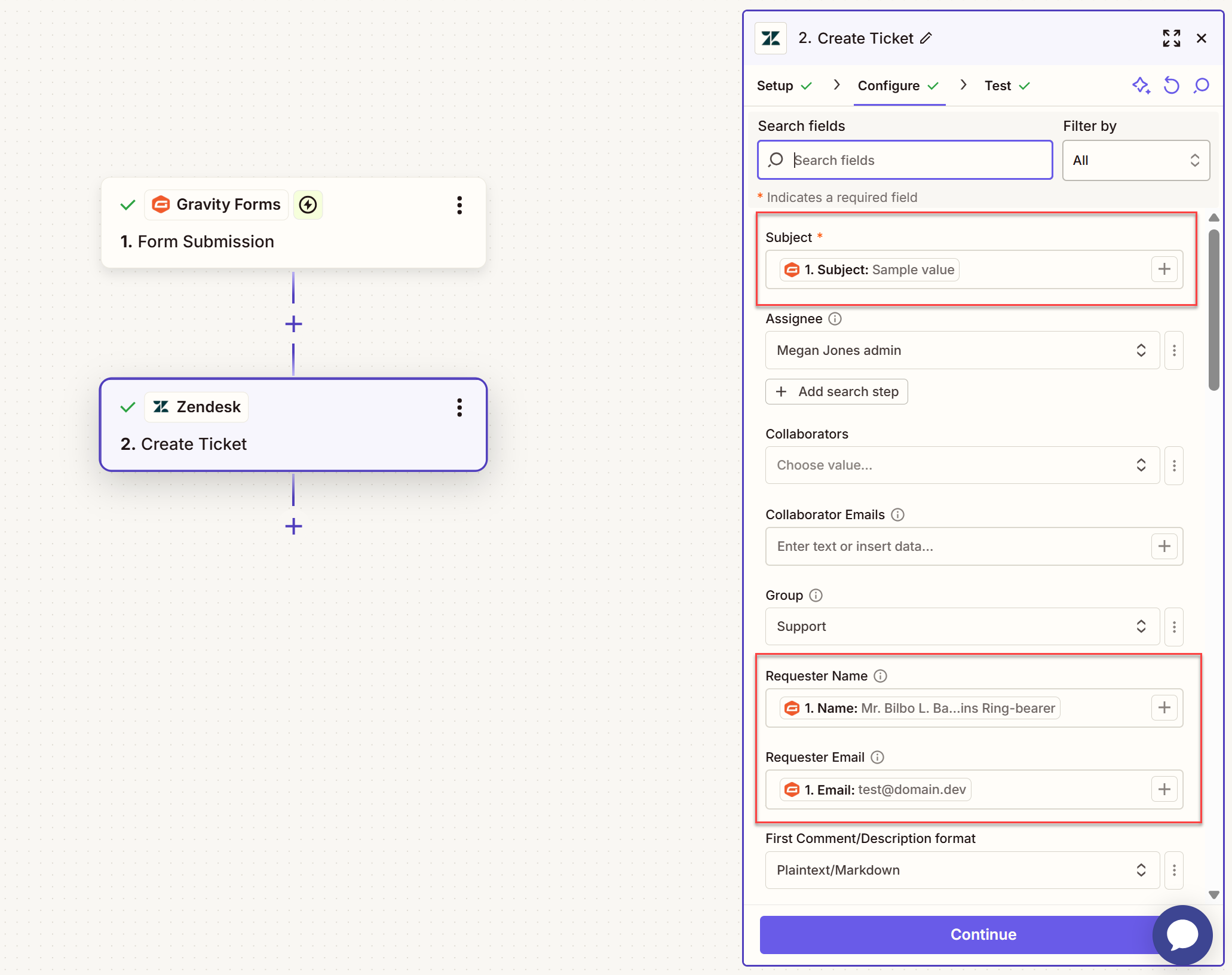 If there is other information you want to send to Zendesk from Gravity Forms, you can configure that as well. When you are ready, click Continue.