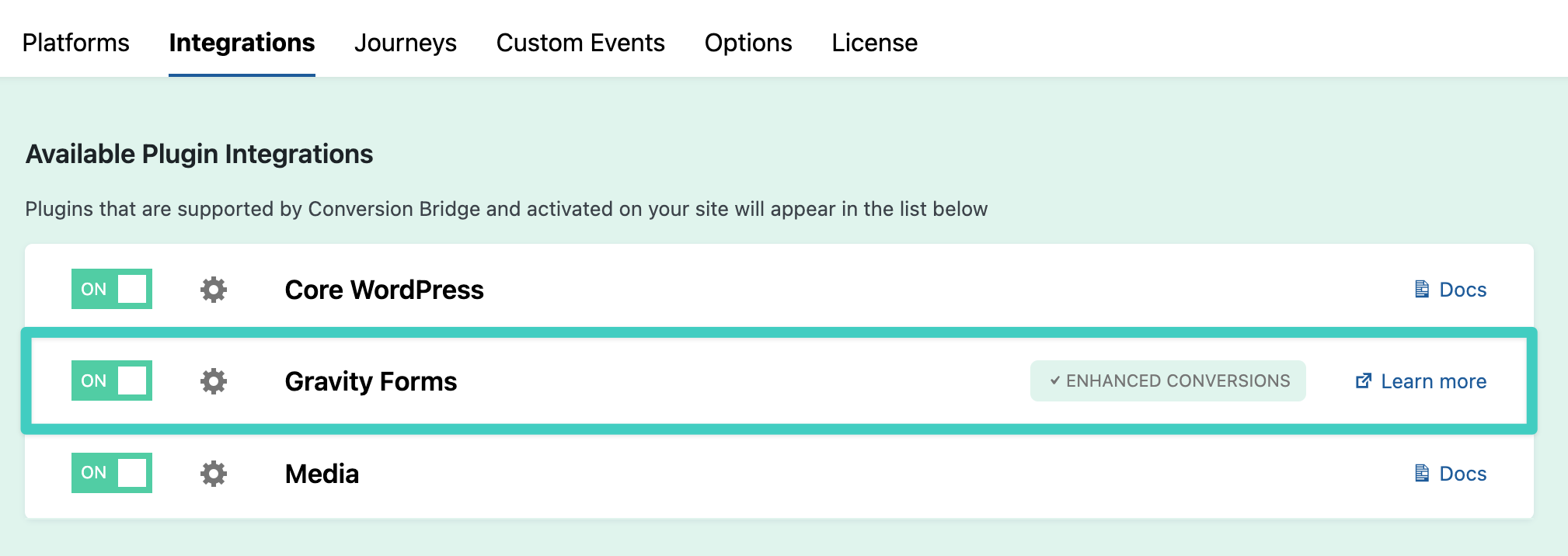Now go to the Integrations Tab within the Conversion Bridge settings page. Here you will click the On toggle to enable the integration.