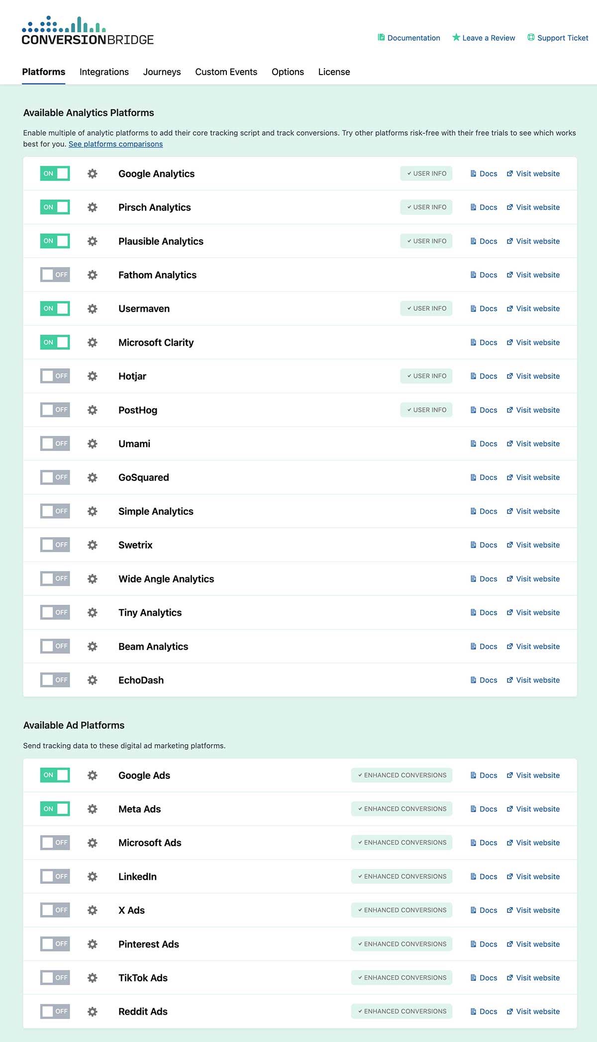 After you have purchased and installed the Conversion Bridge plugin, in your WordPress admin go to Settings →Conversion Bridge → Platforms. Here you can enable any of the many analytics and ad platform integrations that are available (the list is continually growing) with customization setup options unique to each platform.