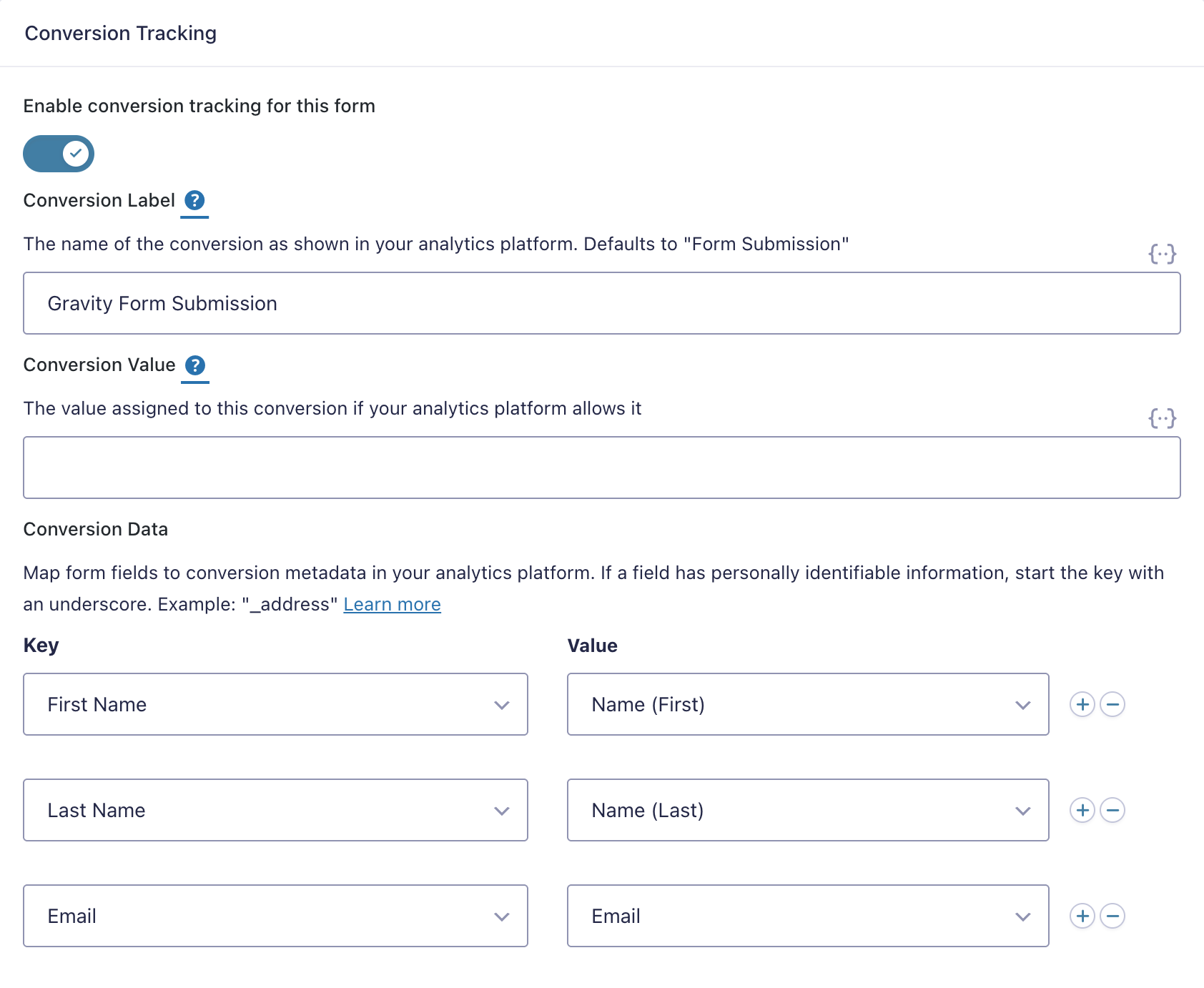 In the Conversion Data settings for your Gravity Form, under Key, select one of the pre-designated fields for Email, First Name, or Last Name. For Value, choose the form field that corresponds to that data point.
