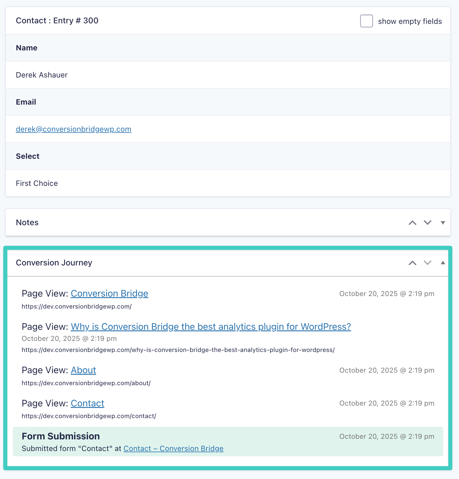 The Conversion Journey is automatically added to the entry data in your WordPress admin:
