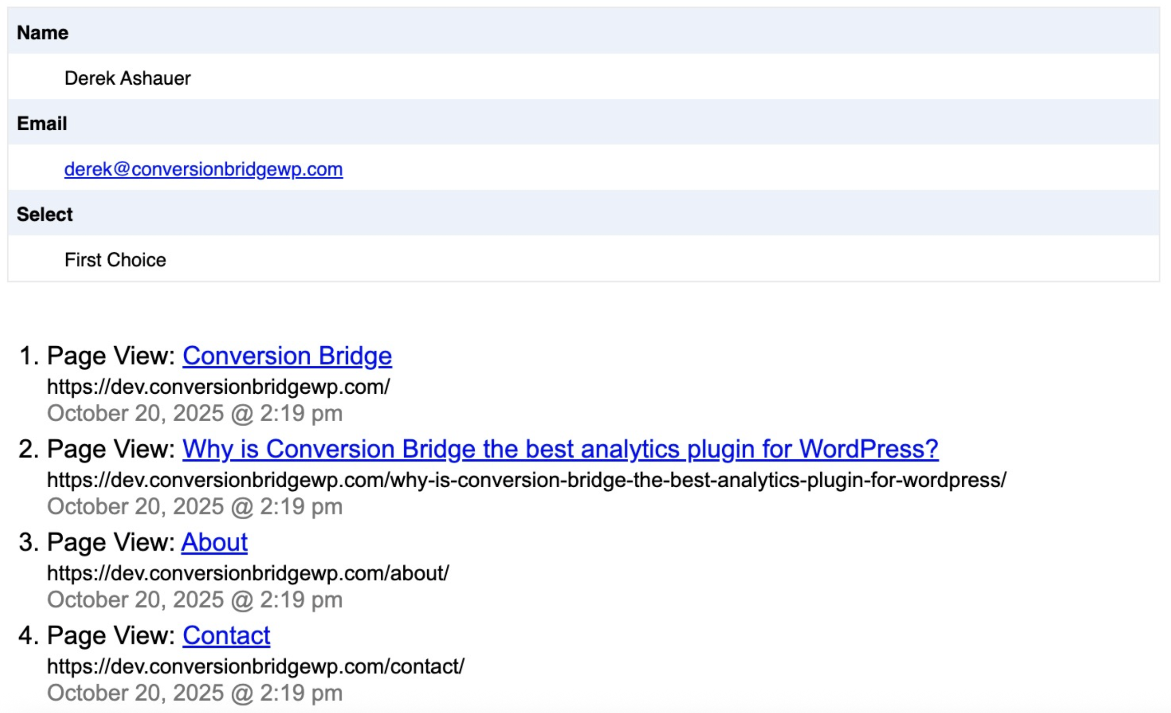 Conversion Bridge automatically builds these journeys by tracking pageviews and interactions across your site. When a user submits a Gravity Form, a Conversion Journey is associated with the submission.