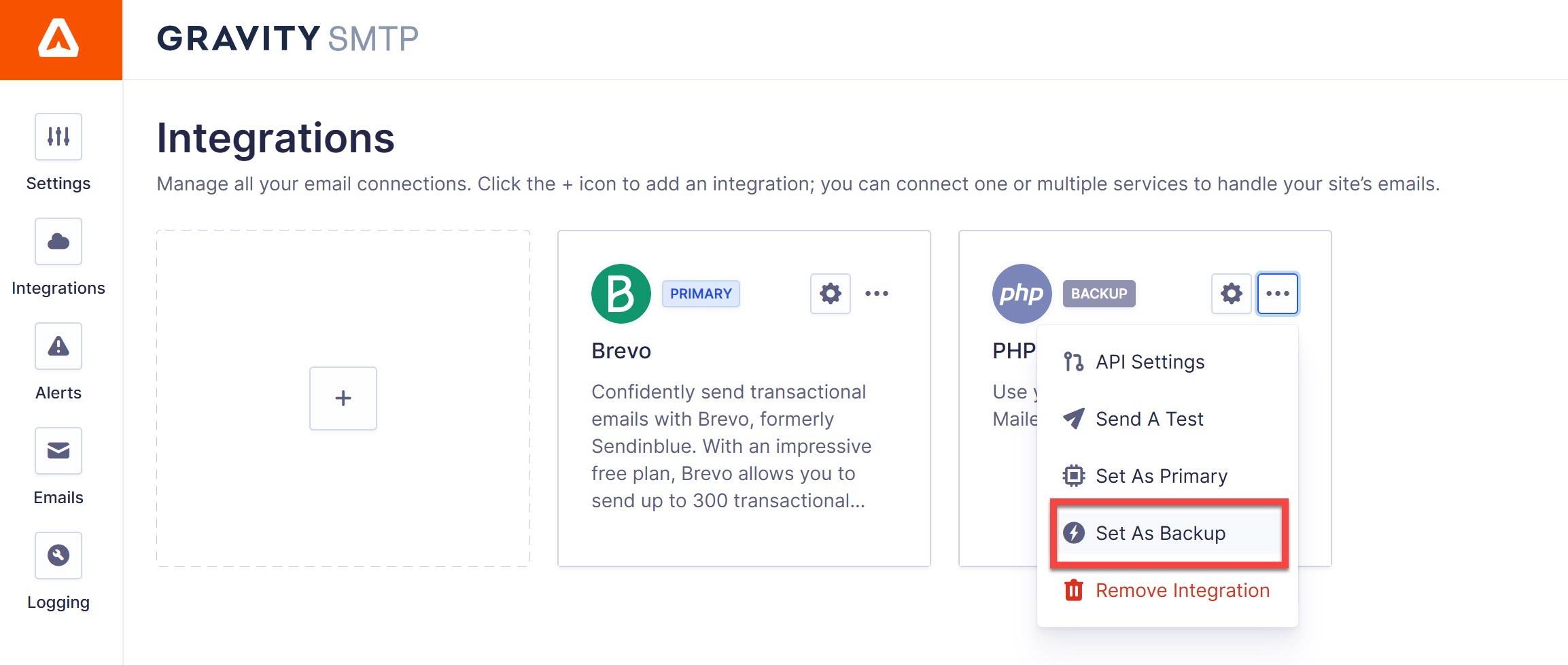 In Gravity SMTP, you can easily specify any service as the backup option in the integrations list. Gravity SMTP will then clearly mark it as the backup provider.