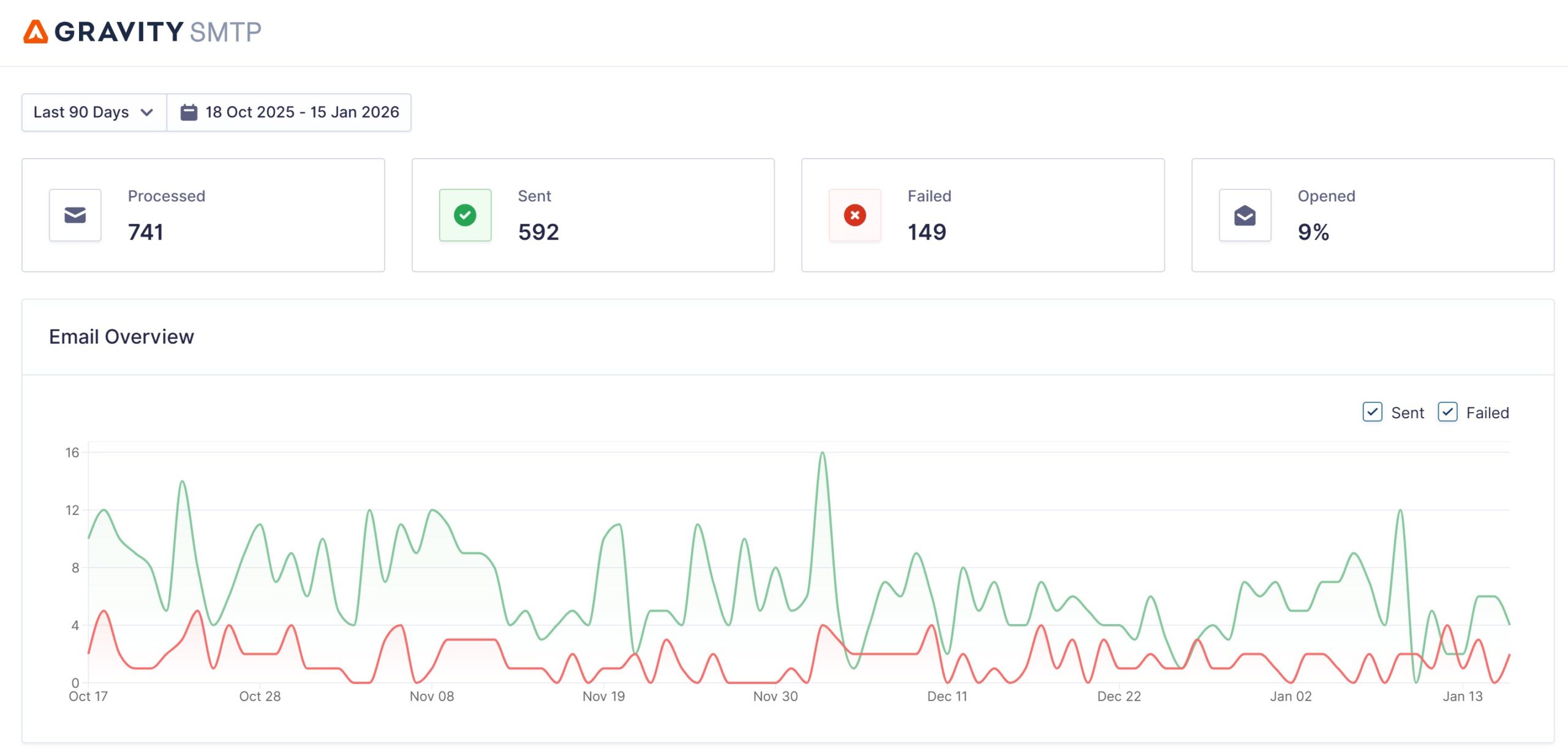 With Gravity SMTP you can get a summary of your site’s recent email sends, and stay on top of email performance without having to log in. Key metrics include: