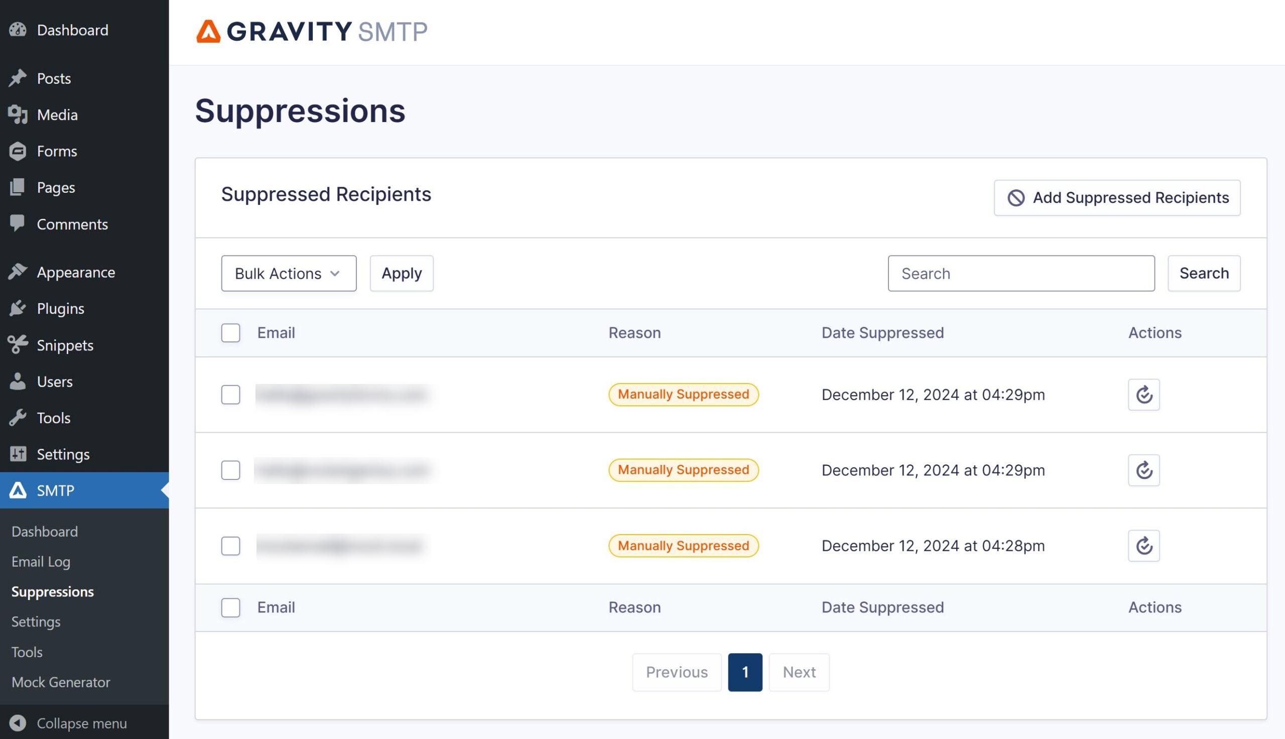 Gravity SMTP a Suppression Management System, which is not available with FluntSMTP. This allows site admins to view and add to a suppression list, helping to manage email delivery by blocking specific addresses from receiving messages.