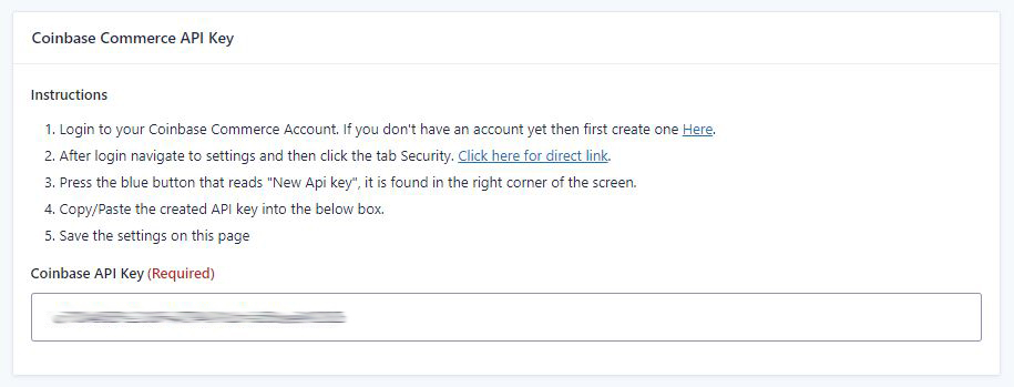 After installation, you will have to navigate to the new add-on’s Settings to enter your Coinbase Commerce API key. You can get the API key from the Coinbase Profile Information on the API Settings tab.