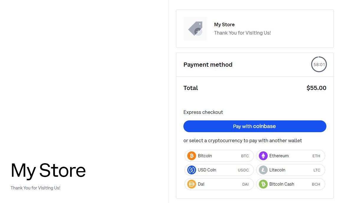 Now you are ready to get paid in crypto! When users go through the form, they will be redirected to Coinbase Commerce, where they can choose between 7 major cryptocurrencies (Bitcoin, Ethereum, Bitcoin Cash, Doge, USDC, DAI, or Litecoin).