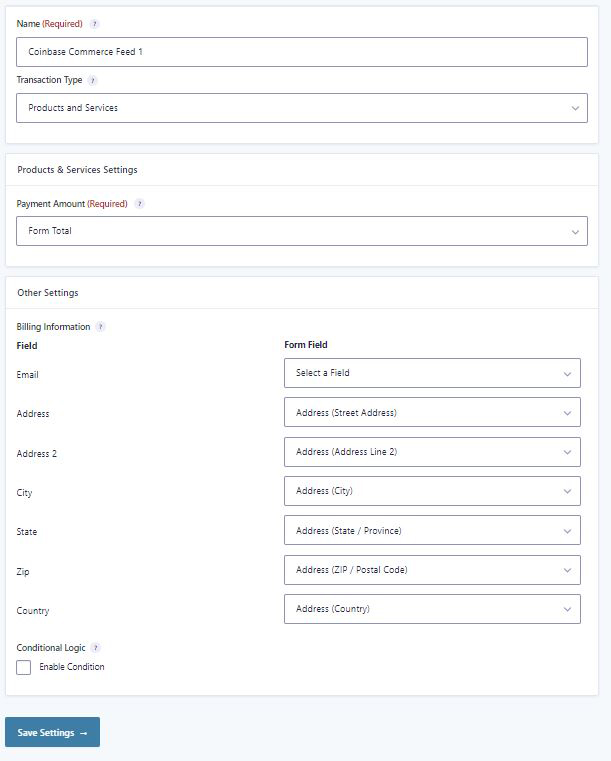 Lastly, you will have to configure the payment feed for your form. The plugin supports conditional logic so you can use it together with other gateways such as Stripe or PayPal.