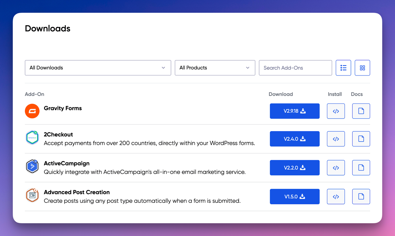 On the Downloads screen, you can “skip the scroll” and instead search through our entire library of Gravity Forms Add-Ons by name, with the list refreshing as you type.