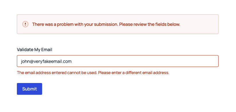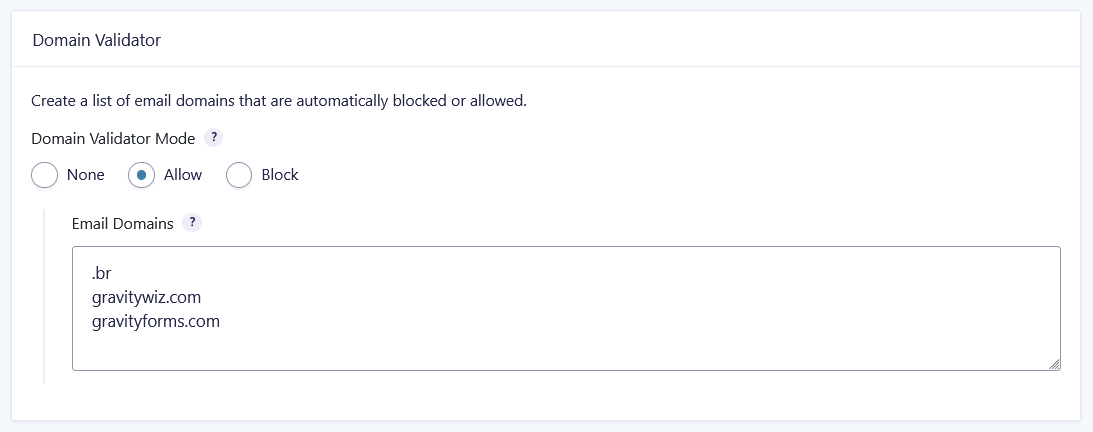 Nip undesired emails in the bud with domain validation. Block known spammer domain addresses or only allow select domains to submit to your forms. Targeting top-level domains such as `.gov` is supported, too.