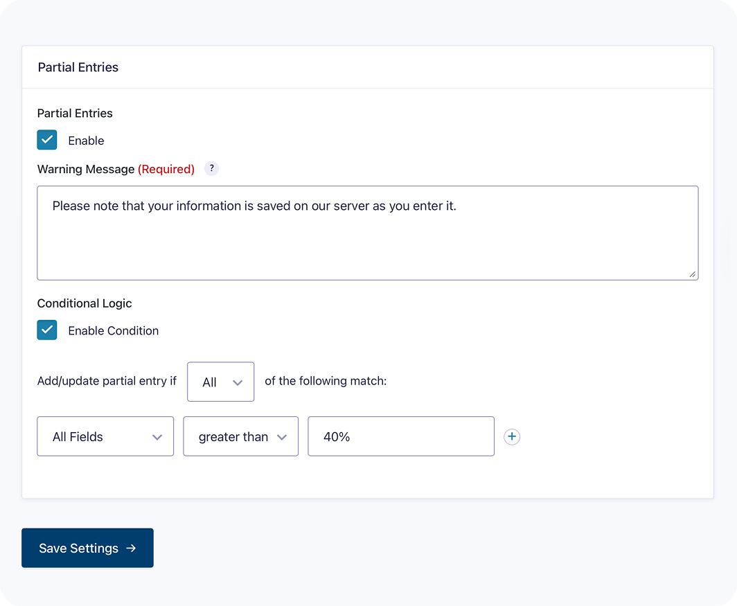 Enable Partial Entries on any form, set your capture rules, and start recovering leads – setup takes minutes.