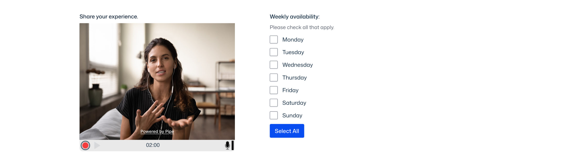 Capture video directly through your forms. Pipe handles video recording from desktop and mobile devices in various file formats and ensures secure storage and delivery.